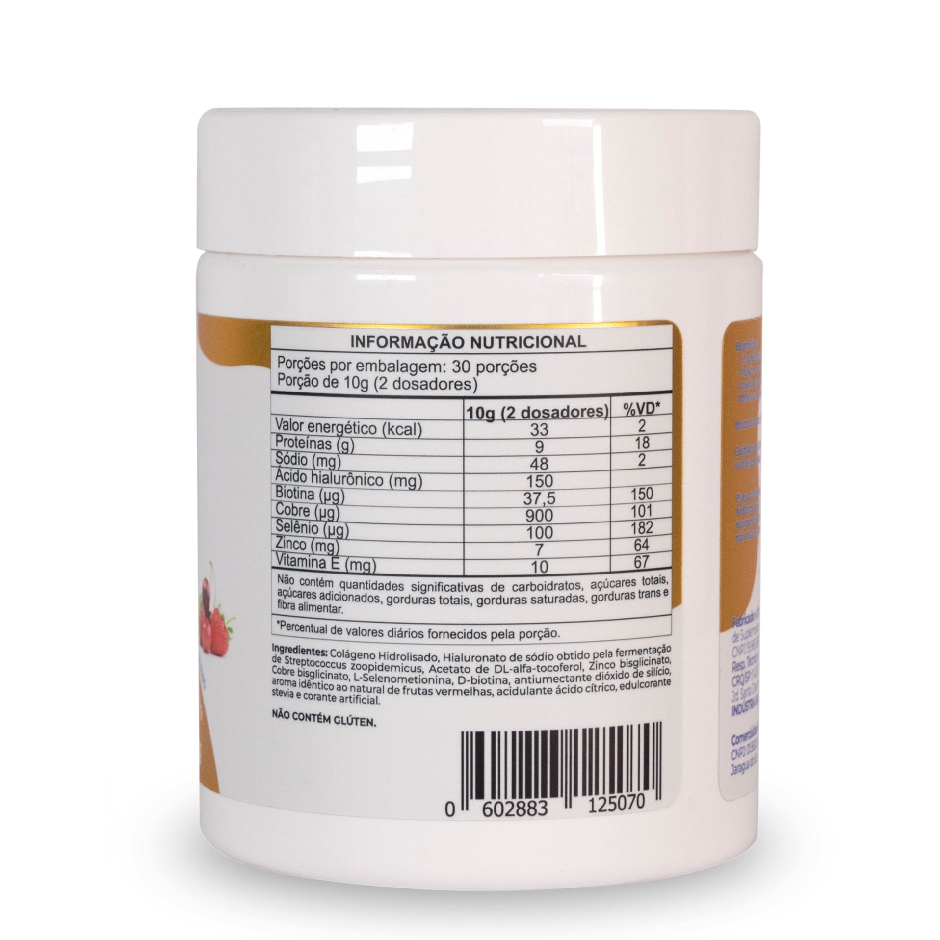 Colágeno hidrolisado 9,2g + ácido hialurônico 150mg + cobre 300mcg